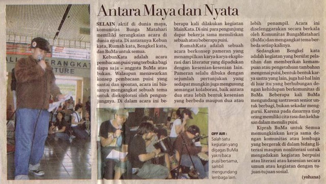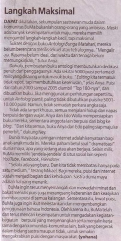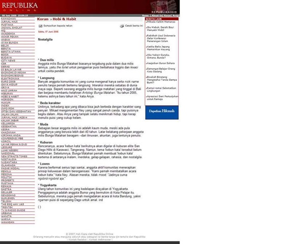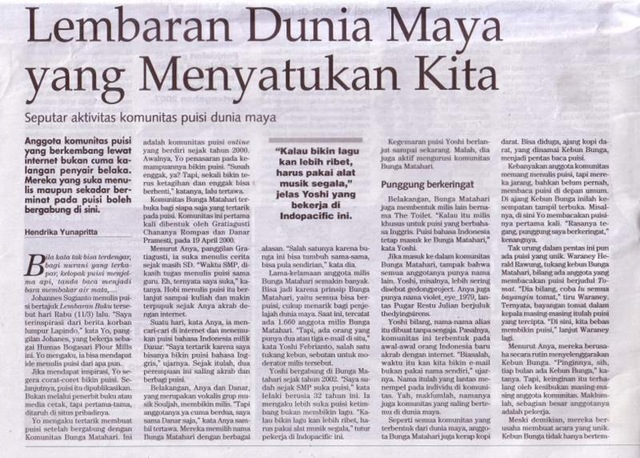 In 2000, while studying English literature at the University of Indonesia (UI) she set up a mailing list called Bunga Matahari (Sunflower) for people to submit and share their poems. Eight years later, the mailing list has around 1,600 members. She has produced an anthology of poetry titled “Antologi Bunga Matahari” (2006) and the site has evolved into a community with regular gatherings for poetry readings.