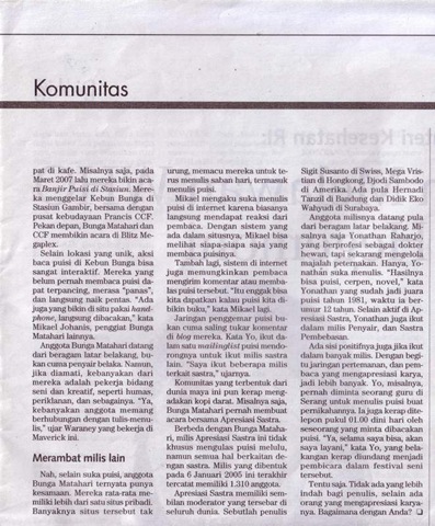 Other cyber communities that focus on literature have also emerged, such as Cybersastra, Fordisastra, and Sastra Pembebasan.
