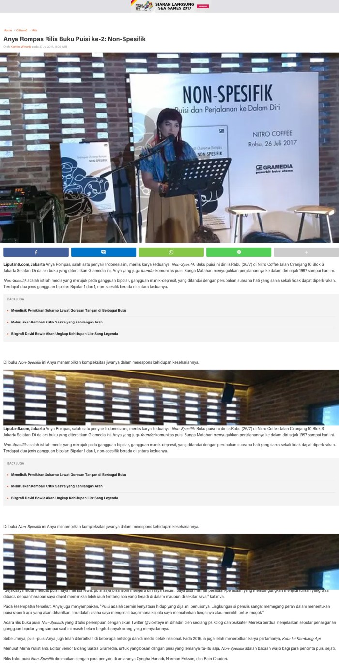 She is one of the founders of Komunitas BungaMatahari, a mailing list-based Indonesian poetry community that have embraced many poetry enthusiasts with its catchphrase “semua bisa berpuisi” or, roughly translated, “poetry for all”. She is also involved in Selatan, a literary journal, and Paviliun Puisi, a monthly open mic event--both managed by her and her like-minded friends.