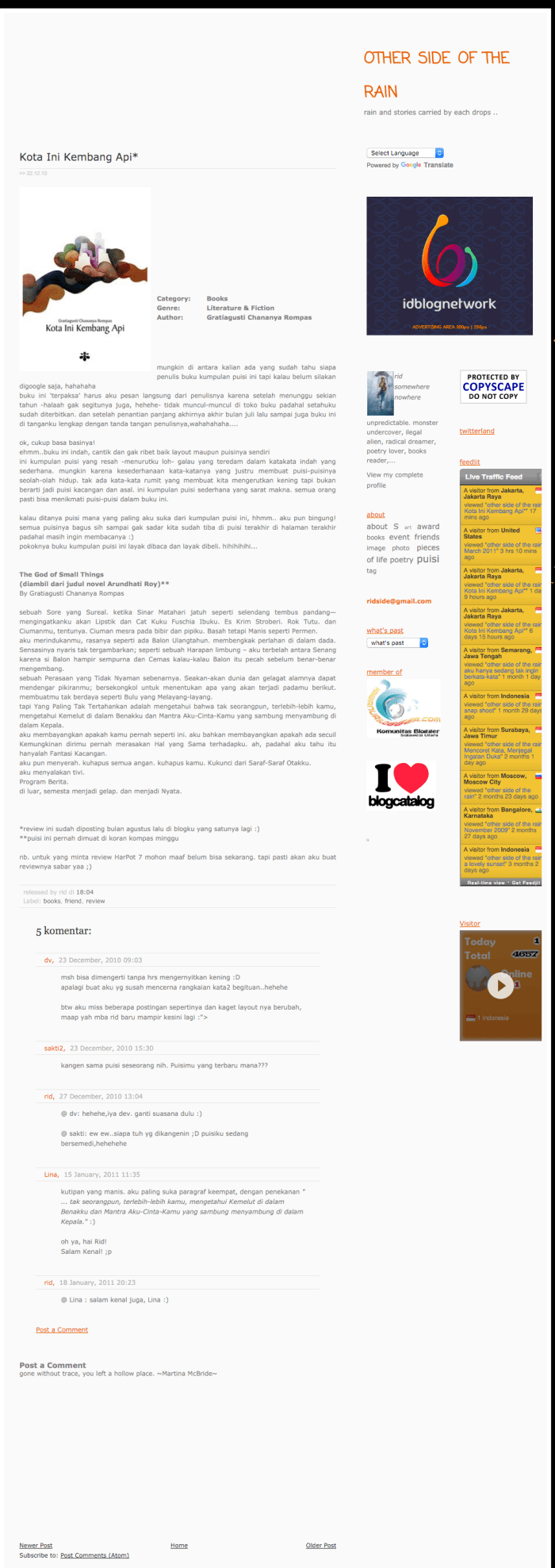 Gratiagusti Chananya Rompas was born in Jakarta, 19 August 1979. She studied English Literature in Universitas Indonesia, Depok (2003) and received her masters in The Gothic Imagination from University of Stirling, Scotland (2005). She is one of the founders of Komunitas BungaMatahari, a mailing list-based Indonesian poetry community that have embraced many poetry enthusiasts with its catchphrase “semua bisa berpuisi” or, roughly translated, “poetry for all”. She is also involved in Selatan, a literary journal, and Paviliun Puisi, a monthly open mic event--both managed by her and her like-minded friends. She currently resides in Jakarta, trying to find balance between writing and day-to-day living. View all posts by violeteye