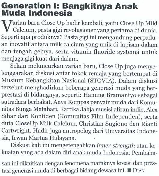 Acara tersebut dihadiri oleh beberapa tokoh muda berprestasi seperti Hanung Bramantyo (Sutrarada terbaik FFI 2005), Tika (Musisi Indie dengan album Defrosted Love Song), Anya (Penyair, Pendiri Komunitas Bunga Matahari), Alex Sihar (Konfiden- Komunitas Film Independent), dan dua duta CloseUp Milk Calcium, Christian Sugiono dan Rianti Cartwright. Turut hadir dalam acara tersebut Irwan Matua (AntropoloG UI), dan Andrie Darusman, (Marketing Manager Oral Care PT Unilever Indonesia).